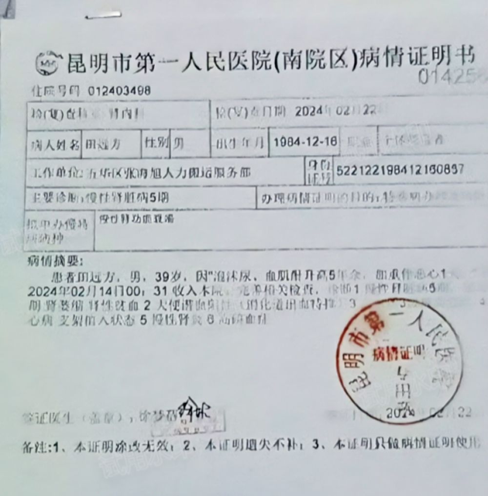 2017年,田遠(yuǎn)方加入麗江順豐,成了站點里最勤懇的員工之一。然而,今年2月16日,醫(yī)院的一紙診斷書,將他的人生推入嚴(yán)冬——“尿毒癥期,雙腎萎縮”。醫(yī)生要求他立即停下工作接受治療。那一刻,田遠(yuǎn)方想到的是在餐廳做服務(wù)員、月薪2500元的妻子,是剛滿十歲的兒子,是全家都指著他每月6500元收入過活的生計。他沒有把生病的事告訴任何人,默默將診斷書塞進(jìn)抽屜,繼續(xù)堅守崗位。“我要是休息了,家人怎么辦?”這個樸實的貴州漢子,把苦都咽進(jìn)了肚子里,每天依舊早早地出現(xiàn)在快遞站點,分揀、裝車、送貨,仿佛什么都沒有發(fā)生。