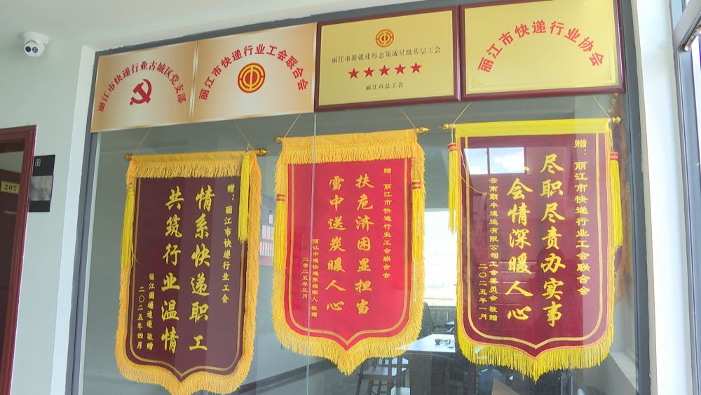 快遞工會聯(lián)合會收到的部分錦旗。 麗江融媒記者張麗瑤 攝
