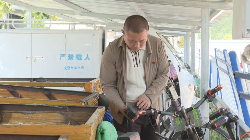 麗江市快遞行業(yè)工會聯(lián)合會主席王云龍在園區(qū)普惠充電站檢查充電設(shè)備。 麗江融媒記者張麗瑤 攝